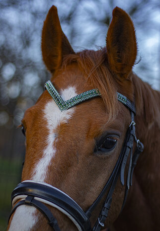 Browband Emerald is made of 5 rows of emerald stones this is a fantastic dark green colour. In the middle is a row of large emerald stones and around it are 4 rows of small emerald stones.